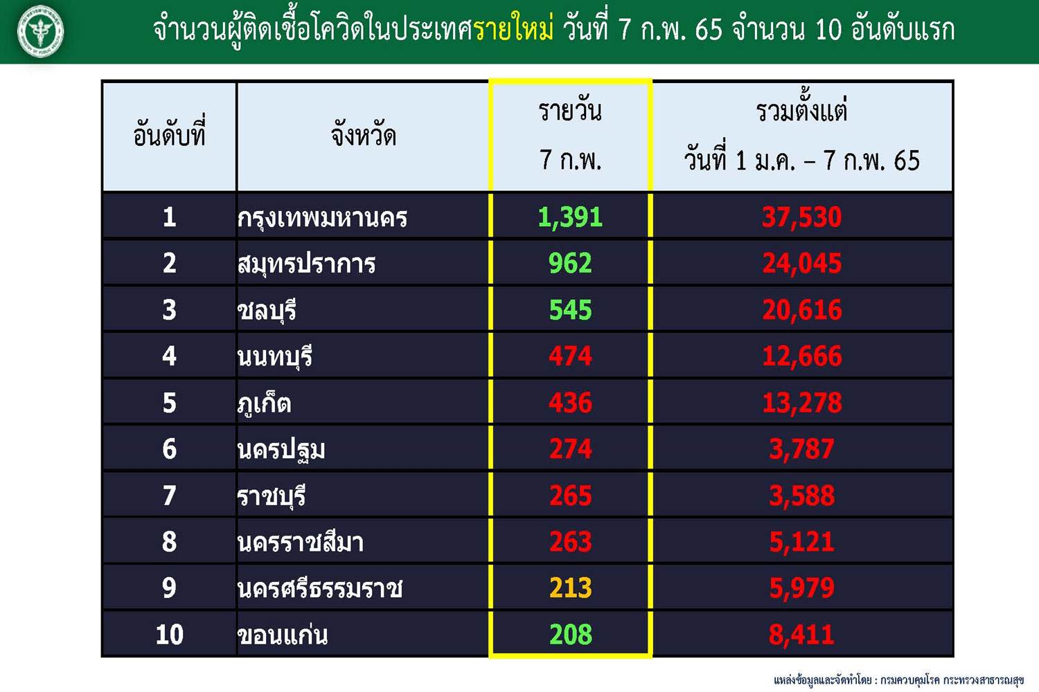 เมื่อวันที่ 7 ก.พ. 65 ศูนย์บริหารสถานการณ์โควิด-19 (ศบค.) รายงานสถานการณ์การแพร่ระบาดของไวรัสโควิด-19 ในประเทศประจำวันดังนี้