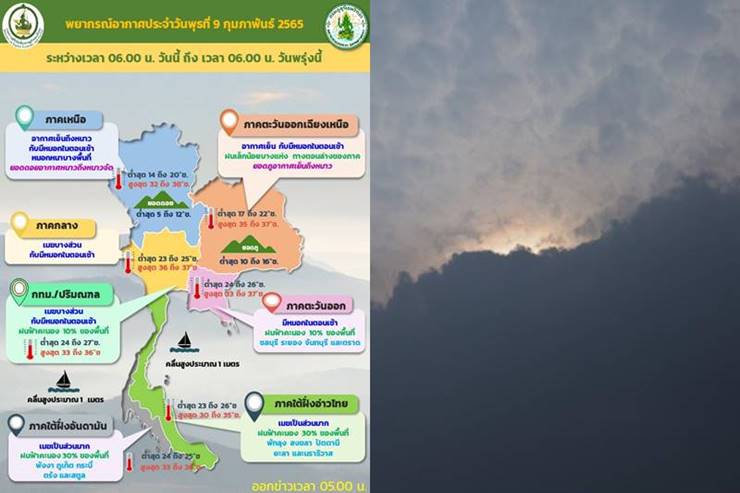 กรมอุตุนิยมวิทยา พยากรณ์อากาศประจำวันที่ 9 กพ. 2565 ลักษณะอากาศทั่วไป พยากรณ์อากาศ 24 ชั่วโมงข้างหน้า ลมฝ่ายตะวันตกในระดับบนยังคงพัดปกคลุมภาคเหนือตอนบน ทำให้บริเวณดังกล่าวมีอากาศเย็นถึงหนาวในตอนเช้า ในขณะที่บริเวณความกดอากาศสูงหรือมวลอากาศเย็นที่ปกคลุมประเทศไทยตอนบนและทะเลจีนใต้มีกำลังอ่อน ทำให้บริเวณประเทศไทยตอนบนมีหมอกในตอนเช้า กับมีหมอกหนาในบางพื้นที่ แต่ยังคงมีอากาศเย็นในตอนเช้าบริเวณภาคตะวันออกเฉียงเหนือ ขอให้ประชาชนบริเวณประเทศไทยตอนบนระมัดระวังอันตรายในการสัญจรผ่านบริเวณที่มีหมอกในระยะนี้ไว้ด้วย