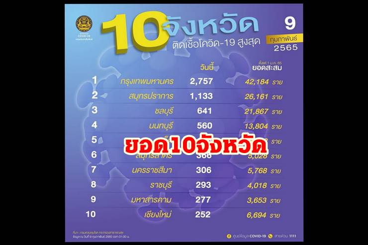 เมื่อวันที่ 9 ก.พ. 65 ศูนย์บริหารสถานการณ์การแพร่ระบาดของโรคติดเชื้อไวรัสโคโรนา 2019 (ศบค.) รายงานสถานการณ์การแพร่ระบาดของไวรัสโควิด-19 ในประเทศประจำวันดังนี้