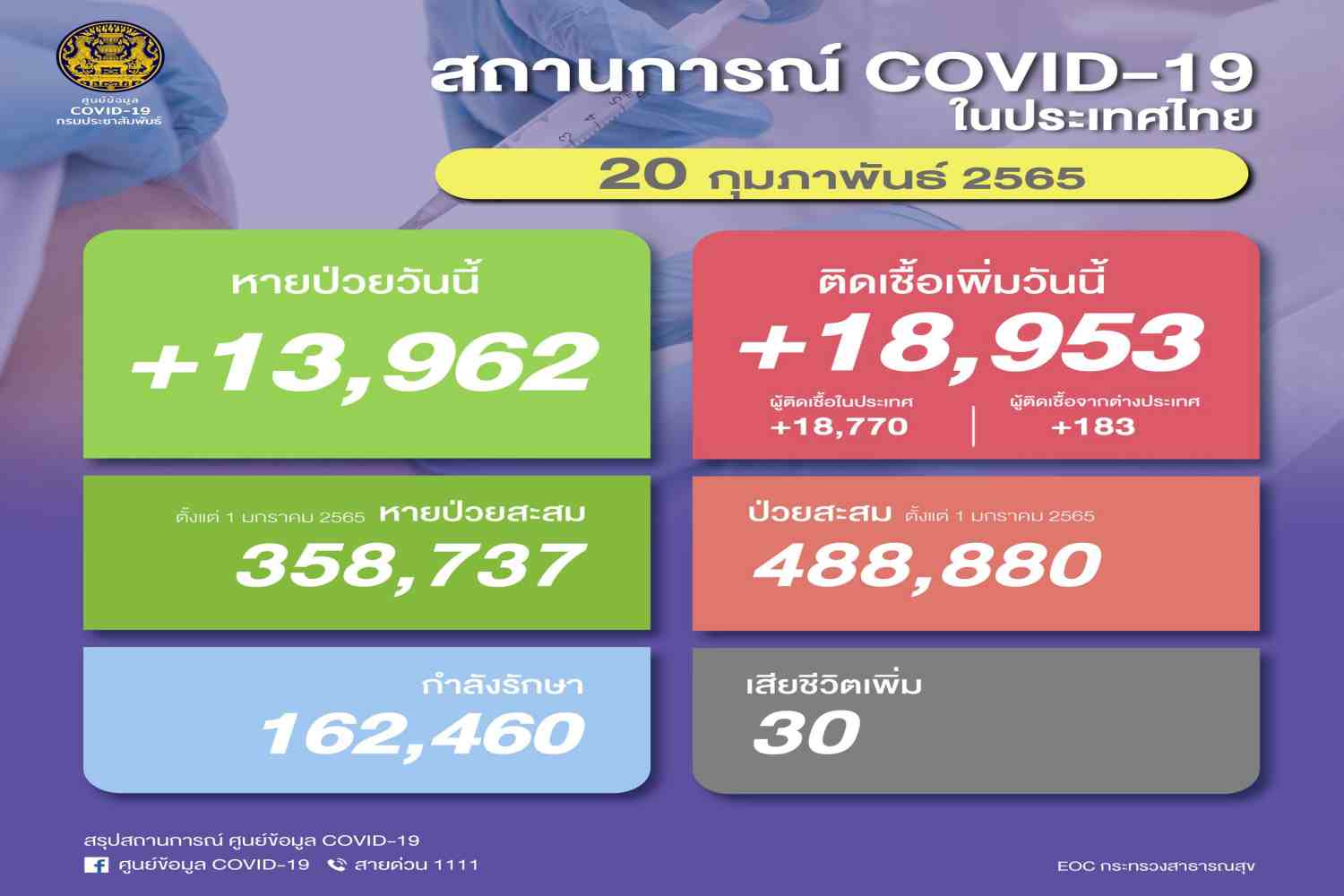 ไทยติดโควิดเพิ่ม 18,953 ราย เสียชีวิตอีก30