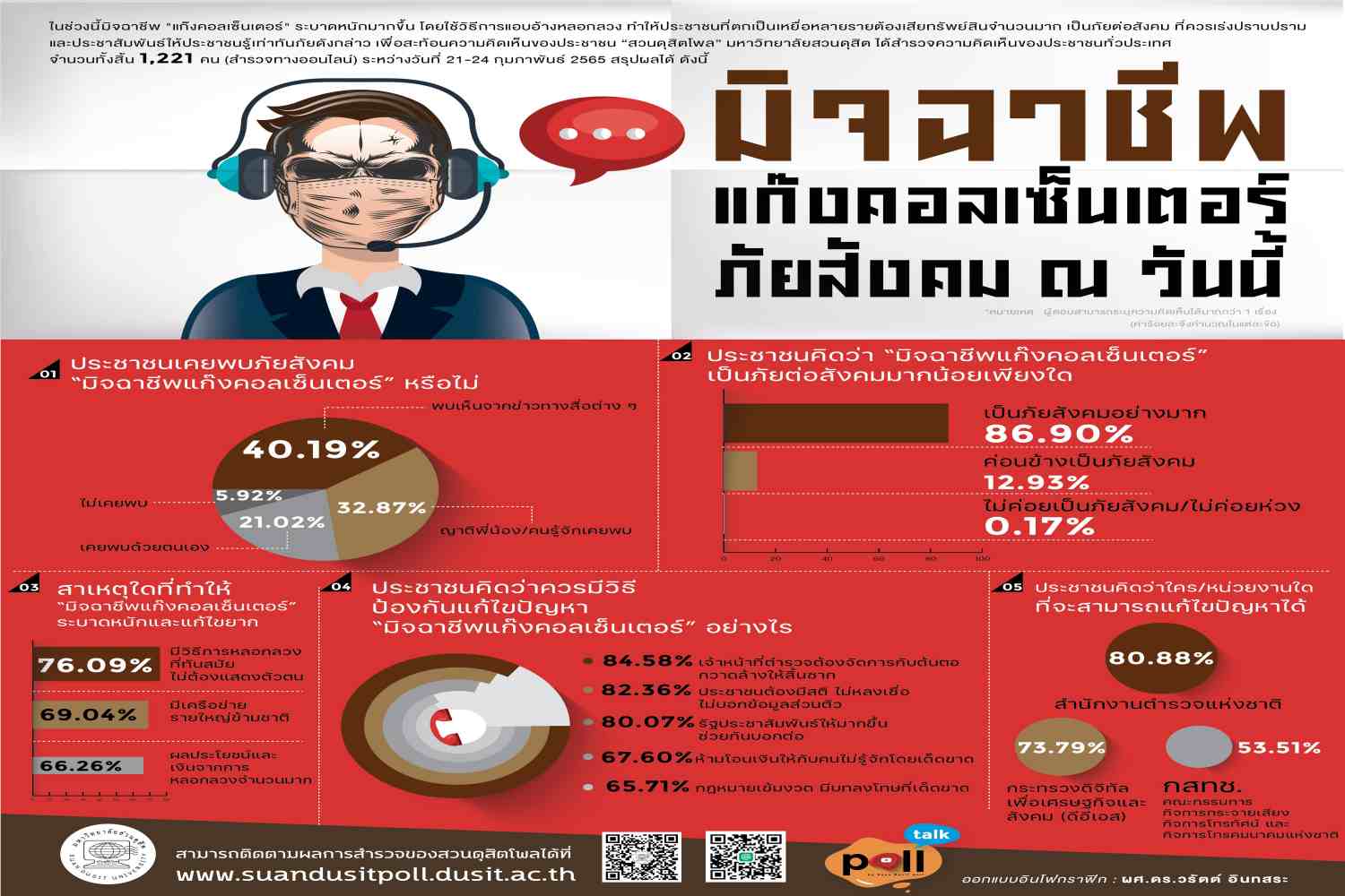 สวนดุสิตโพล มหาวิทยาลัยสวนดุสิต สำรวจความคิดเห็นของประชาชนทั่วประเทศ จำนวนทั้งสิ้น 1,221 คน ระหว่างวันที่ 21-24 กุมภาพันธ์ 2565 พบว่า การพบเจอมิจฉาชีพแก๊งคอลเซ็นเตอร์ ส่วนใหญ่พบเห็นจากข่าวทางสื่อ ต่าง ๆ ร้อยละ 40.19 รองลงมาคือ ญาติพี่น้อง/คนรู้จักเคยพบ ร้อยละ 32.87 เคยพบด้วยตนเอง ร้อยละ 21.02 ไม่เคยพบ ร้อยละ 5.92