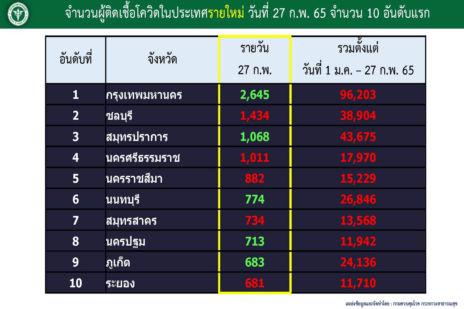 10จังหวัดติดโควิดสูงสุด กทม.อันดับ1จำนวน 2,645 ราย