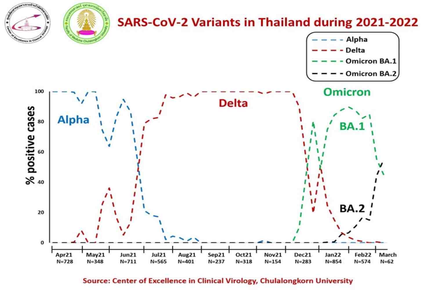 สายพันธุ์โอมิครอน เองก็มีการวิวัฒนาการ เป็นสายพันธุ์ย่อย BA.1 BA.2 …. รู้กันว่าสายพันธุ์ BA.2 แพร่กระจายได้เร็วกว่าสายพันธุ์ BA.1 ประมาณ 1.4 เท่า แต่ความรุนแรงของโรคไม่เปลี่ยนแปลง จึงทำให้ขณะนี้พบสายพันธุ์ส่วนใหญ่ในประเทศไทย BA.2 และคงจะมาแทนที่ทั้งหมดในเร็ววันนี้ ดังแสดงในรูปที่ศูนย์ได้ดำเนินการศึกษามาโดยตลอด