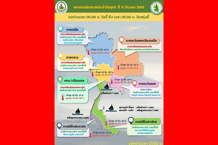 กรมอุตุนิยมวิทยา พยากรณ์อากาศประจำวันที่ 11 มี.ค. 2565 ลักษณะอากาศทั่วไป พยากรณ์อากาศ 24 ชั่วโมงข้างหน้า หย่อมความกดอากาศต่ำเนื่องจากความร้อนปกคลุมประเทศไทยตอนบน ทำให้บริเวณดังกล่าวมีอากาศร้อน ในขณะที่ลมใต้และลมตะวันออกเฉียงใต้กำลังอ่อนพัดปกคลุมประเทศไทยตอนบนและอ่าวไทย ทำให้มีฝนฟ้าคะนองบางแห่งบริเวณด้านตะวันตกของภาคเหนือ ภาคกลาง ภาคตะวันออก รวมทั้งกรุงเทพมหานครและปริมณฑล และภาคใต้ ขอให้ประชาชนบริเวณประเทศไทยตอนบน ดูแลรักษาสุขภาพเนื่องจากสภาพอากาศร้อนนี้ไว้ด้วย