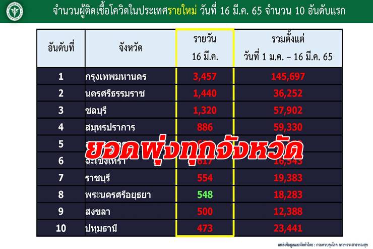 -จํานวนผู้ติดเชื้อโควิดในประเทศรายใหม่ วันนี้ 10 จังหวัดอันดับแรก 1.กรุงเทพมหานคร 3,457 ราย 2.นครศรีธรรมราช 1,440 ราย 3.ชลบุรี 1,320 ราย 4.สมุทรปราการ 886 ราย 5.สมุทรสาคร 678 ราย 6.ฉะเชิงเทรา 617 ราย 7.ราชบุรี 554 ราย 8.พระนครศรีอยุธยา 548 ราย 9.สงขลา 500 ราย และ 10.ปทุมธานี 473 ราย