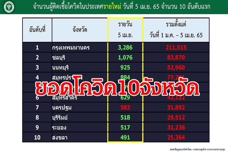 -จํานวนผู้ติดเชื้อโควิดในประเทศรายใหม่ วันนี้ 10 จังหวัดอันดับแรก 1.กรุงเทพมหานคร 3,286 ราย 2.ชลบุรี 1,076 ราย 3.นนทบุรี 925 ราย 4.สมุทรปราการ 884 ราย 5.นครศรีธรรมราช 679 ราย 6.สมุทรสาคร 629 ราย 7.นครปฐม 583 ราย 8.บุรีรัมย์ 518 ราย 9.ระยอง 517 ราย และ 10.สงขลา 491 ราย