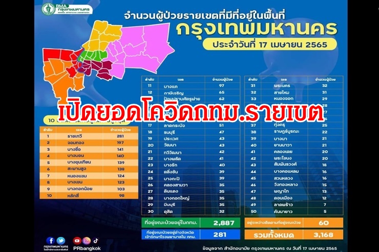 เมื่อวันที่ 17 เม.ย. 65 เฟซบุ๊ก กรุงเทพมหานคร โดยสำนักงานประชาสัมพันธ์ รายงานสถานการณ์การแพร่ระบาดของโรคโควิด-19 ในพื้นที่กทม.ประจำวันพบผู้ป่วยติดเชื้อโควิดทั้งหมด 3,168 ราย พบผู้ติดเชื้อทั้ง 50 เขต โดยเขตราชเทวี ติดเชื้อสูงสุด 281 ราย ตามด้วยเขตจอมทอง197 ราย และเขตบางซื่อ 141 ราย ตามลำดับ ขณะที่มีผู้เสียชีวิต 7 ราย