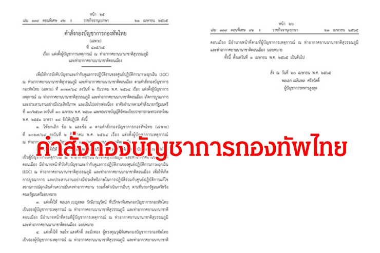ราชกิจจานุเบกษา เผยแพร่ คำสั่ง กองบัญชาการกองทัพไทย (เฉพาะ) แต่งตั้ง 3 นายพล ทำหน้าที่ผู้บัญชาการเหตุการณ์ ท่าอากาศยานนานาชาติสุวรรณภูมิ และท่าอากาศยานนานาชาติดอนเมือง
