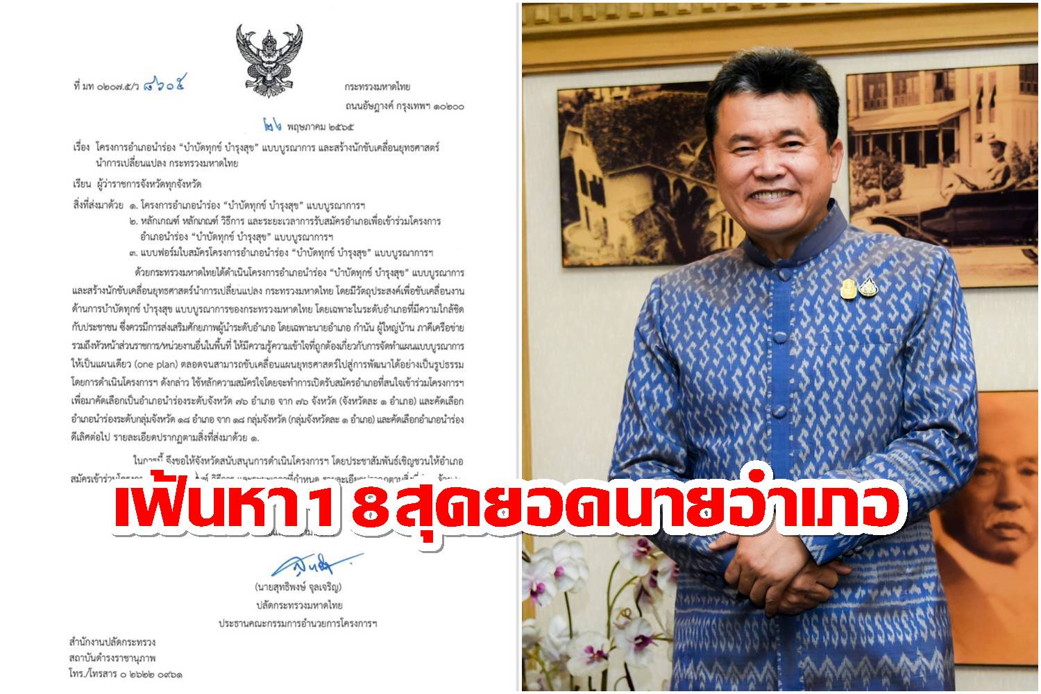 ปลัดมหาดไทยเชิญชวนนายอำเภอ 878 แห่งทั่วประเทศสมัครเข้าร่วมโครงการอำเภอนำร่อง บำบัดทุกข์ บำรุงสุข บูรณาการสร้างนักขับเคลื่อนยุทธศาสตร์นำการเปลี่ยนแปลงเพื่อเป็น"สุดยอด 18 นายอำเภอของประเทศไทย"