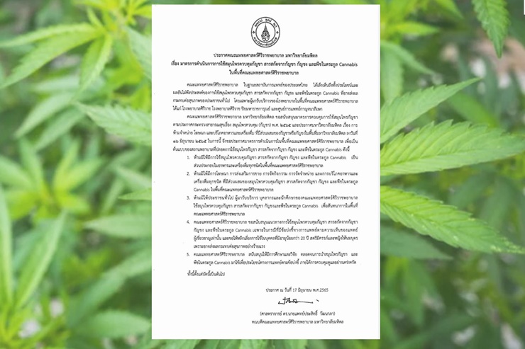 คณะแพทย์ศาสตร์ศิริราช หนุนประกาศ สธ.คุมกัญชาเป็นสมุนไพรควบคุม ห้ามใช้ ห้ามขายอาหาร เครื่องดื่มที่ส่วนผสมกัญชา ในพื้นที่โรงพยาบาล