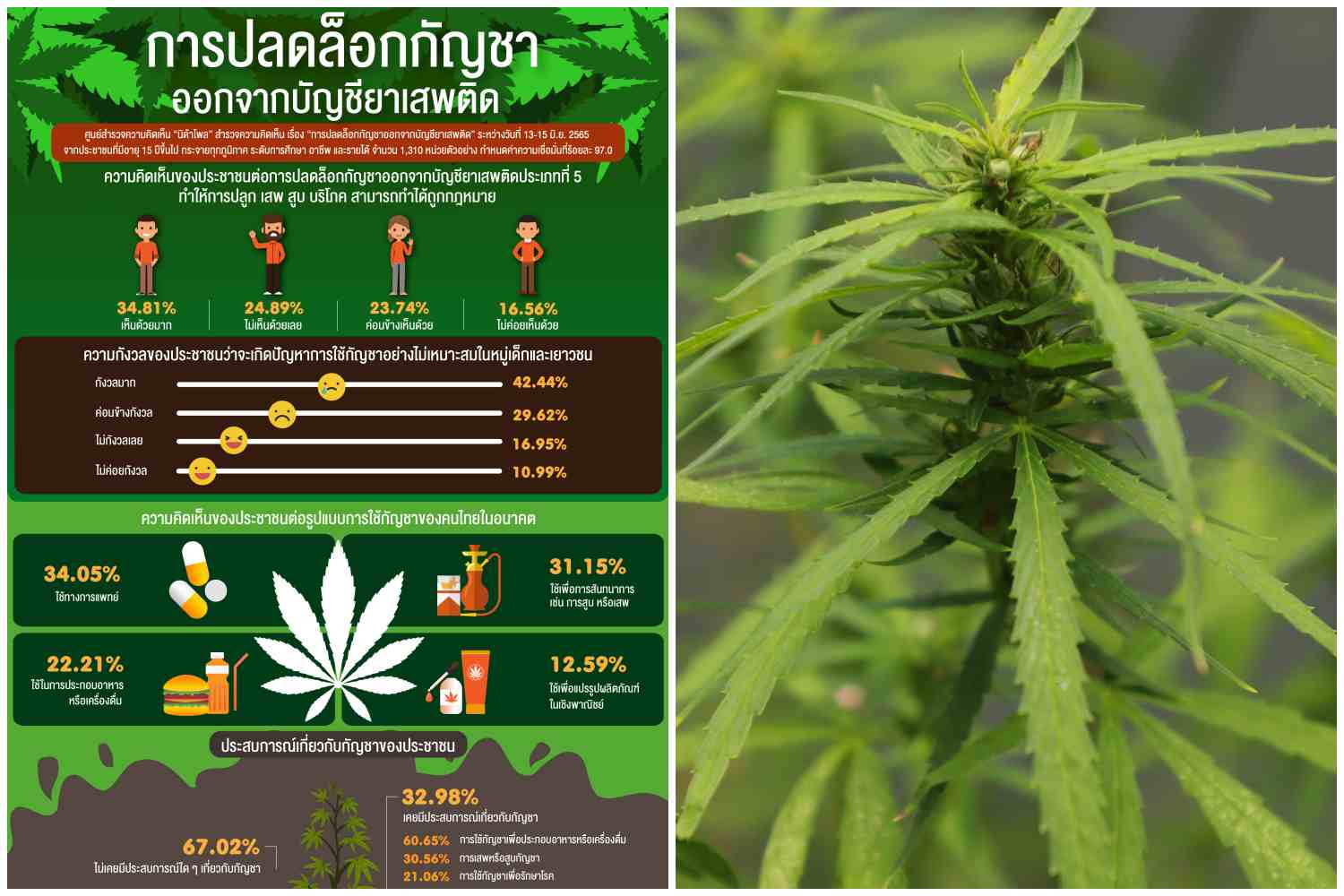 จากการสำรวจเมื่อถามถึงความคิดเห็นของประชาชนต่อการปลดล็อกกัญชาออกจากบัญชียาเสพติดประเภทที่ 5 ทำให้การปลูก เสพ สูบ บริโภค สามารถทำได้ถูกกฎหมาย พบว่า ตัวอย่าง ร้อยละ 34.81 ระบุว่า เห็นด้วยมาก เพราะ กัญชาเป็นพืชเศรษฐกิจ สร้างรายได้ และเป็นพืชสมุนไพรที่สามารถใช้เป็นยารักษาโรคได้ รองลงมา ร้อยละ 24.89 ระบุว่า ไม่เห็นด้วยเลย เพราะ กัญชาเป็นสิ่งที่ไม่ดีต่อเด็กและเยาวชน เป็นสารเสพติดชนิดหนึ่ง