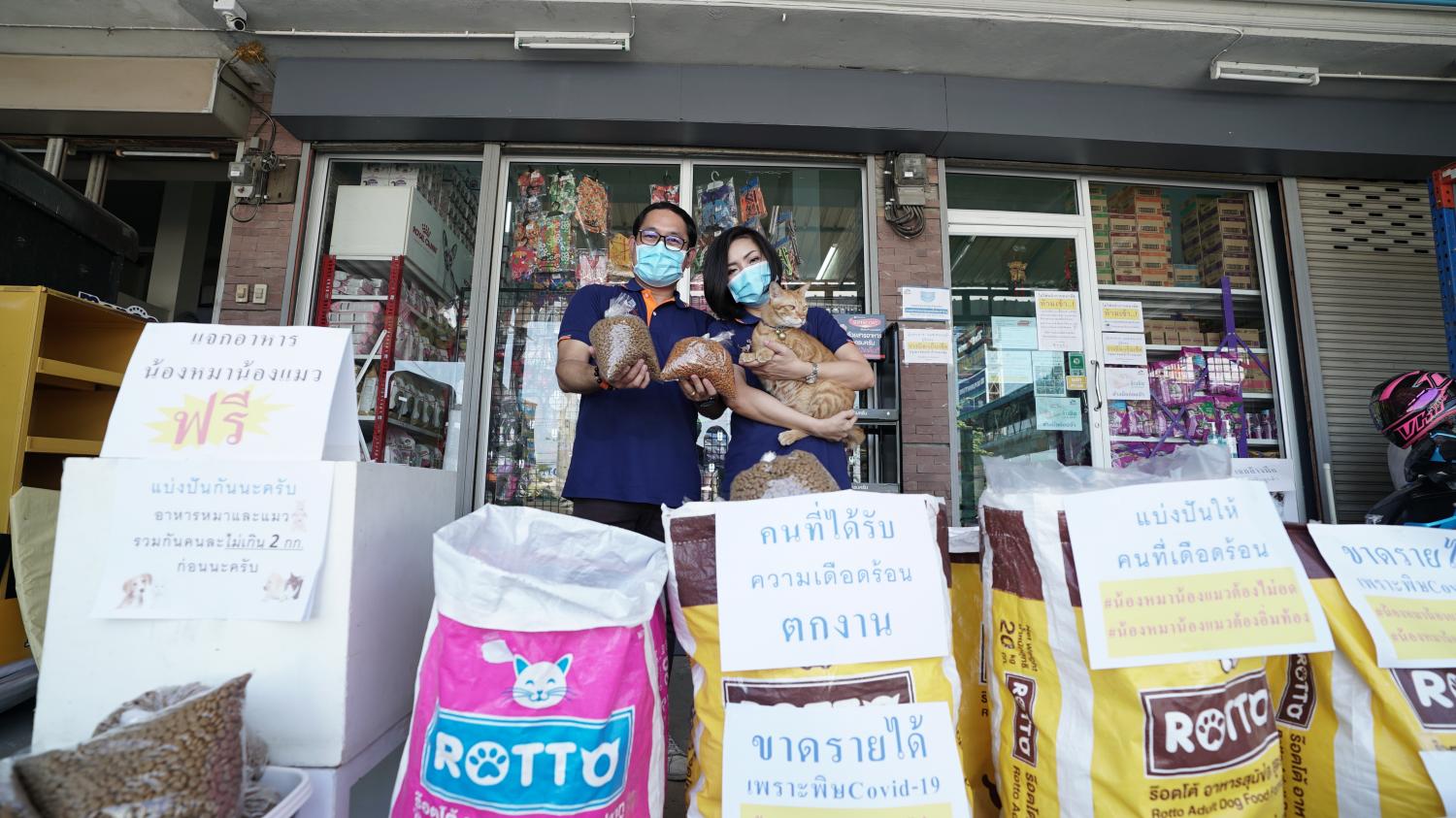 ในช่วงปลายเดือนมีนาคมที่ผ่านมาทั้งคู่จึงได้เอาเงินเก็บส่วนตัวสั่งอาหารเม็ดทั้งหมด 200 กิโลกรัม พร้อมกับติดป้ายข้อความ ‘แบ่งปันให้คนที่เดือดร้อน’ น้องหมาน้องแมวต้องไม่อด น้องหมาน้องแมวต้องอิ่มท้องเพื่อช่วยเหลือในจุดเล็กๆ ให้เขาผ่านพ้นไปได้ด้วยกัน