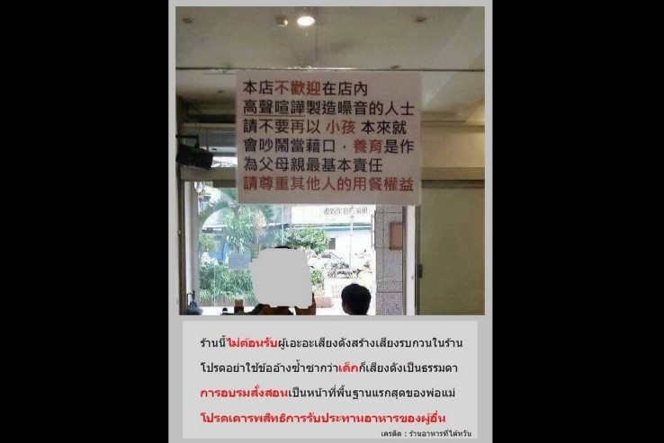 เมื่อวันที่ 31 ธ.ค. เพจเฟซบุ๊กชื่อ ลูกคุณไม่ได้น่ารักสำหรับทุกคน ได้โพสต์ภาพถ่ายที่ระบุว่าเป็นป้ายที่ติดไว้ภายในร้านอาหารแห่งหนึ่งที่ประเทศไต้หวัน ซึ่งแปลเป็นภาษาไทยได้ว่า