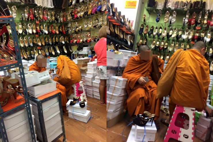 โดยสมาชิกเฟซบุ๊กชื่อ น้อง ได้โพสต์ภาพพระสงฆ์ 2 รูปกำลังนั่งก้มหน้าก้มตาใส่รองเท้าส้นสูงภายในร้านขายรองเท้าสตรี ณ ห้างดังแห่งหนึ่งย่านปิ่นเกล้า