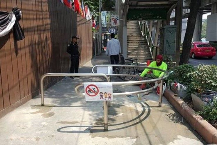 เมื่อวันที่ 5 มี.ค.สมาชิกเฟซบุ๊กชื่อ Torplus Nick Yomnak โพสต์ภาพ "อลูมิเนียม" ที่ถูกออกเเบบให้เป็นราวกั้นรถจักรยานยนต์วิ่งบนทางเท้า โดยที่รถเข็นคนพิการ รถเข็นเด็ก คนเดินถนนทั่วไป เเละผู้ใช้จักรยานยังสามารถผ่านได้อย่างสะดวก โดยอุปกรณ์ดังกล่าวโรงเรียนนานาชาติ Bangkok Prep มอบให้เพื่อเป็นสาธารณะประโยชน์แก่สำนักงานเขตวัฒนา และ สน.ทองหล่อ พร้อมกันนี้ยังได้ติดตั้งกล้องวิดีโอเพื่อติดตามการใช้งานจริงอีกด้วย