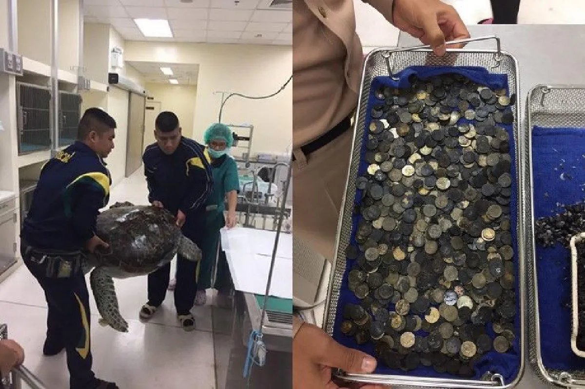คณะเเพทย์ทำการผ่าตัด เต่าตนุที่พบในบ่อเลี้ยงร้าง พบสิ่งแปลกแปลมเป็นเหรียญหลายสกุลเงินอัดแน่นเต็มกระเพาะ