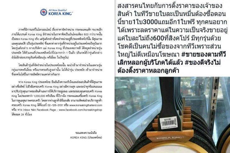เมื่อวันที่ 6 พ.ค. โคเรีย คิง ประเทศไทย ได้เผยแพร่เอกสารชี้แจงกรณีที่ในโลกออนไลน์มีการเผยแพร่ภาพกระทะของของโครเรีย คิง ที่จำหน่ายอยู่ในประเทศสิงคโปร์ ในราคาเพียง 600 บาทนั้น