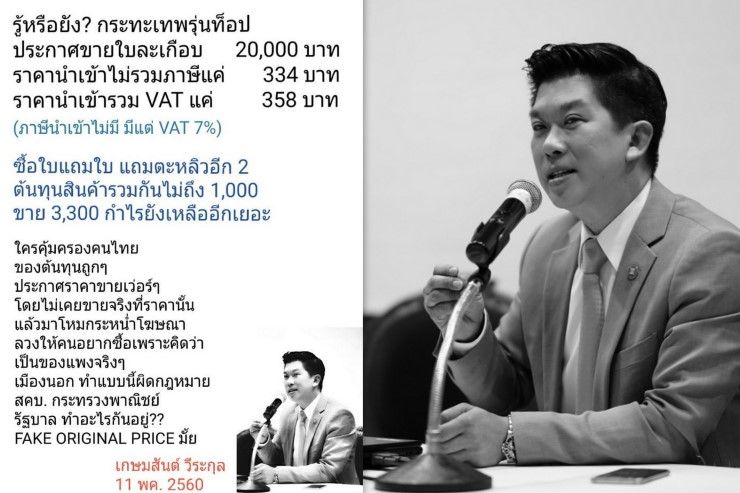 ใครเป็นผู้คุ้มครองผู้บริโภคคนไทย ต้นทุนถูกแต่ประกาศราคาสูงมาก ทั้งที่เวลาขายจริงๆ ไม่เคยขายตามราคาเต็ม แต่กลับลวงให้ประชาชนอยากซื้อ เพราะคิดว่าเป็นของแพงจริงๆ เหตุการณ์เช่นนี้ในต่างประเทศ เป็นเรื่องที่ผิดกฎหมาย สคบ. กระทรวงพานิชย์ทำอะไรกันอยู่?” ผู้ดำเนินรายการชื่อดังระบุ