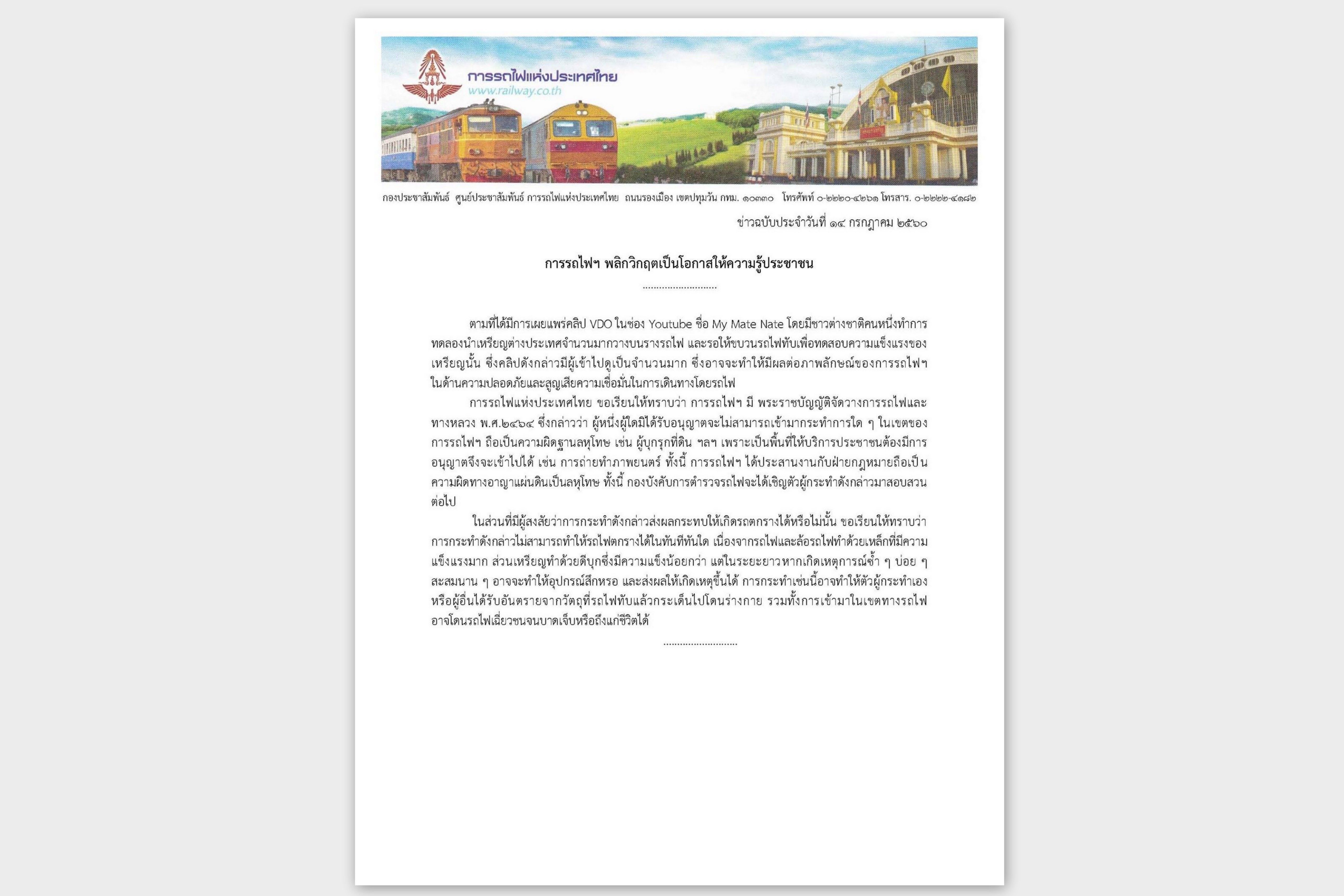 การรถไฟแห่งประเทศไทยออกเอกสารชี้แจงกรณีมีการเผยแพร่คลิป VDO ในช่อง Youtube ชื่อ My Mate Nate ทดลองนำเหรียญต่างประเทศวางบนรางรถไฟ และรอให้ขบวนรถไฟทับเพื่อทดสอบความแข็งแรงของเหรียญ ถือเป็นความผิดทางอาญาแผ่นดินเป็นลหุโทษ ตามพ.ร.บ.จัดวางการรถไฟและทางหลวง พ.ศ.2464 เพราะเป็นพื้นที่ให้บริการประชาชนต้องมีการอนุญาตจึงจะเข้าไปได้ เช่น การถ่ายทำภาพยนตร์ จึงได้ประสานงานกับฝ่ายกฎหมาย โดยกองบังคับการตำรวจรถไฟจะได้เชิญตัวผู้กระทำดังกล่าวมาสอบสวนต่อไป
