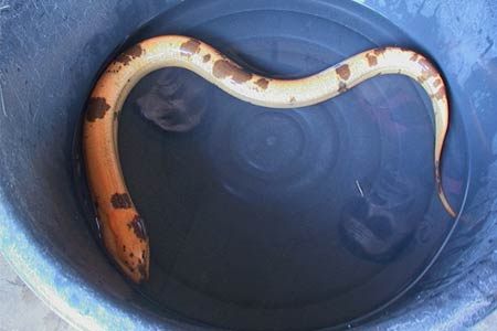 ผู้สื่อข่าวประจำ จ.สุรินทร์ ไดรับแจ้งจากชาวบ้านว่าพบปลาไหลประหลาดมีสีเหลืองทอง จึงเดินทางไปยังบ้านเลขที่ 210/1 ม.8 บ.ตาพราม ต.เทพรักษา อ.สังขะ จ.สุรินทร์ ซึ่งเป็นบ้านของนางบัวเนียม กิ่งแก้ว อายุ 64 ปี เจ้าของบ้าน พบชาวบ้านจำนวนมากพากันมามุงดูความแปลกประหลาดของปลาไหล ส่วนปลาไหลถูกขังไว้ในกะละมัง และพบว่ามีสีเหลืองออกส้ม ดูไปคล้ายสีทองสวยงามมาก มีจุดน้ำตาลกระจายอยู่ตามลำตัวบางส่วน ตัวมีขนาดใหญ่อวบ ความยาวประมาณ 60 ซ.ม.ชาวบ้านสามารถลูบคลำและจับต้องได้ แถมยังเชื่องไม่มีอาการตื่นคนอีกด้วย ขณะที่ชาวบ้านบางรายเชื่อว่าเป็นปลาไหลทองคำ เป็นปลาไหลศักดิ์สิทธิ์และจะเป็นสิริมงคลแก่ครอบครัวของผู้ที่ได้ครอบครอง และบางคนถึงกับต่างพากันยกมือไหว้เพื่อขอพรและเพื่อความเป็นสิริมงคล บางคนพากันตีเป็นเลขเด็ดกันไปต่างๆนานาก่อนวันใกล้วันหวยออก 16 ก.ย.2555 จะถึงนี้อีกด้วย โดยบางคนตีเป็นเลขจากการขดตัวของปลาไหล และลวดลายตามลำตัวของปลาไหล อาทิ 722 723 522 73 72 63 86 ขณะที่ชาวบ้านที่ทราบข่าวต่างทยอยเดินทางไปดูปลาไหลทองคำทุกวันอย่างไม่ขาดสาย