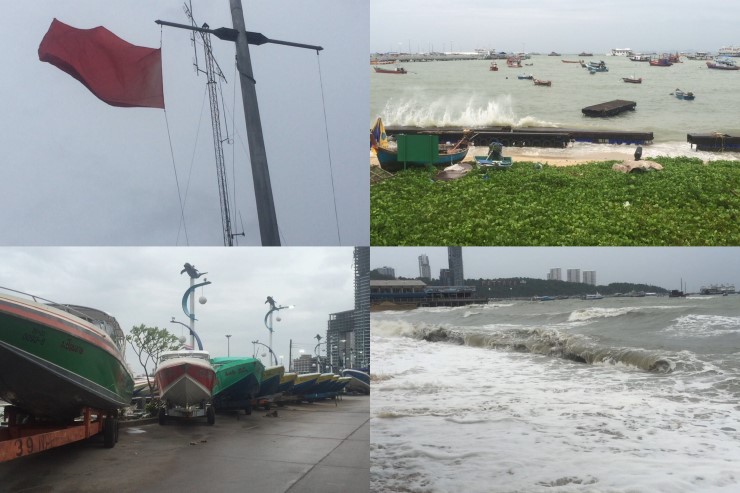 สำนักงานเจ้าท่าภูมิภาคที่ 6 สาขาพัทยาได้ชักธงแดงขึ้นเสา เพื่อเป็นสัญลักษณ์แสดงว่า ห้ามเรือทุกชนิดออกจากฝั่งเป็นเด็ดขาด หากฝ่าฝืนจะมีความผิดตามข้อกฏหมาย เพราะขณะนี้ทะเลอ่าวพัทยามีลมกรรโชกแรง คลื่นชายฝั่งสูงประมาณ 1-3 เมตร ส่วนกลางทะเลสูงกว่า 3 เมตร ขณะนี้เมืองพัทยา จ.ชลบุรี มีพายุฝนตกกระหน่ำ เจ้าหน้าที่กู้ภัยทางทะเล และหน่วยกู้ภัยสว่างบริบูรณ์เมืองพัทยา ได้จัดกำลังเตรียมความพร้อมสำหรับเหตุทางทะเลที่อาจจะเกิดขึ้น จากการตรวจสอบเบื้องต้นยังไม่มีเหตุร้ายใดๆ เกิดขึ้น มีเพียง โป๊ะจอดเรือจำนวนหลายโป๊ะ ที่ผูกอยู่บริเวณท่าเทียบเรือแหลมบาลี ถูกคลื่นซัดจนได้รับความเสียหายขาดออกจากทุ่น ลอยมาเกยตื้นบริเวณชายฝั่ง ซึ่งไม่มีผู้ได้รับบาดเจ็บจากเหตุการณ์ที่เกิดขึ้น