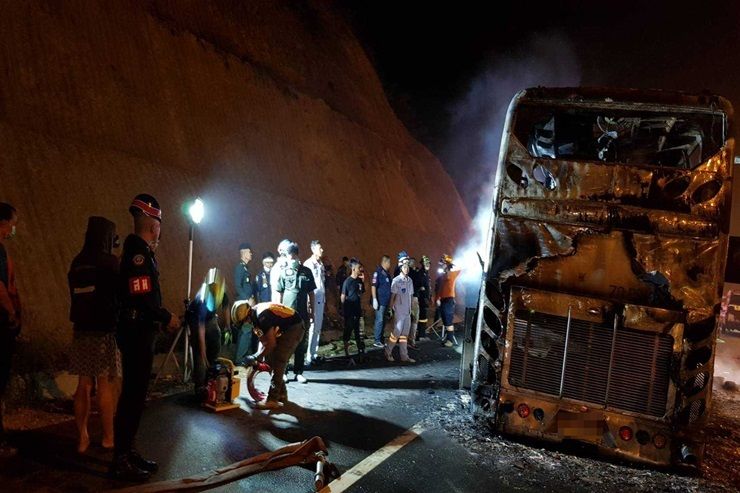 เจ้าหน้าที่ตำรวจ พร้อมหน่วยกู้ภัย ในพื้นที่ เดินทางไปที่เกิดเหตุ พบว่ารถบัสได้ไหม้ทั้งคันแล้ว จากการสอบสวนเบื้องต้นทราบว่ามีผู้บาดเจ็บและเสียชีวิต จำนวนมาก ซึ่งกู้ภัย ได้พยายามระดมกำลังเข้าช่วยเหลือแล้ว โดยทราบว่ามีแรงงานชาวเมียนมาร์เดินทางนั่งมาในรถโดยสารประมาณ 50 คน (เป็นแรงงานชาวเมียนมาร์ 48 คน คนขับรถและภรรยา 2 คน) รวม 50 คน และจากการตรวจสอบพบว่ามีผู้หนีออกมาจากรถทัวร์ได้ 29 คน ส่วนที่เหลือ อีก 21 คน คาดว่าติดภายในรถทัวร์หนีออกมาไม่ทันเสียชีวิต ทั้งหมด โดยถูกไฟคลอกเสียชีวิตภายในรถ ล่าสุดหน่วยงานที่เกี่ยวข้องได้เดินทางไปตรวจสอบสาเหตุของอุบัติเหตุดังกล่าวแล้ว