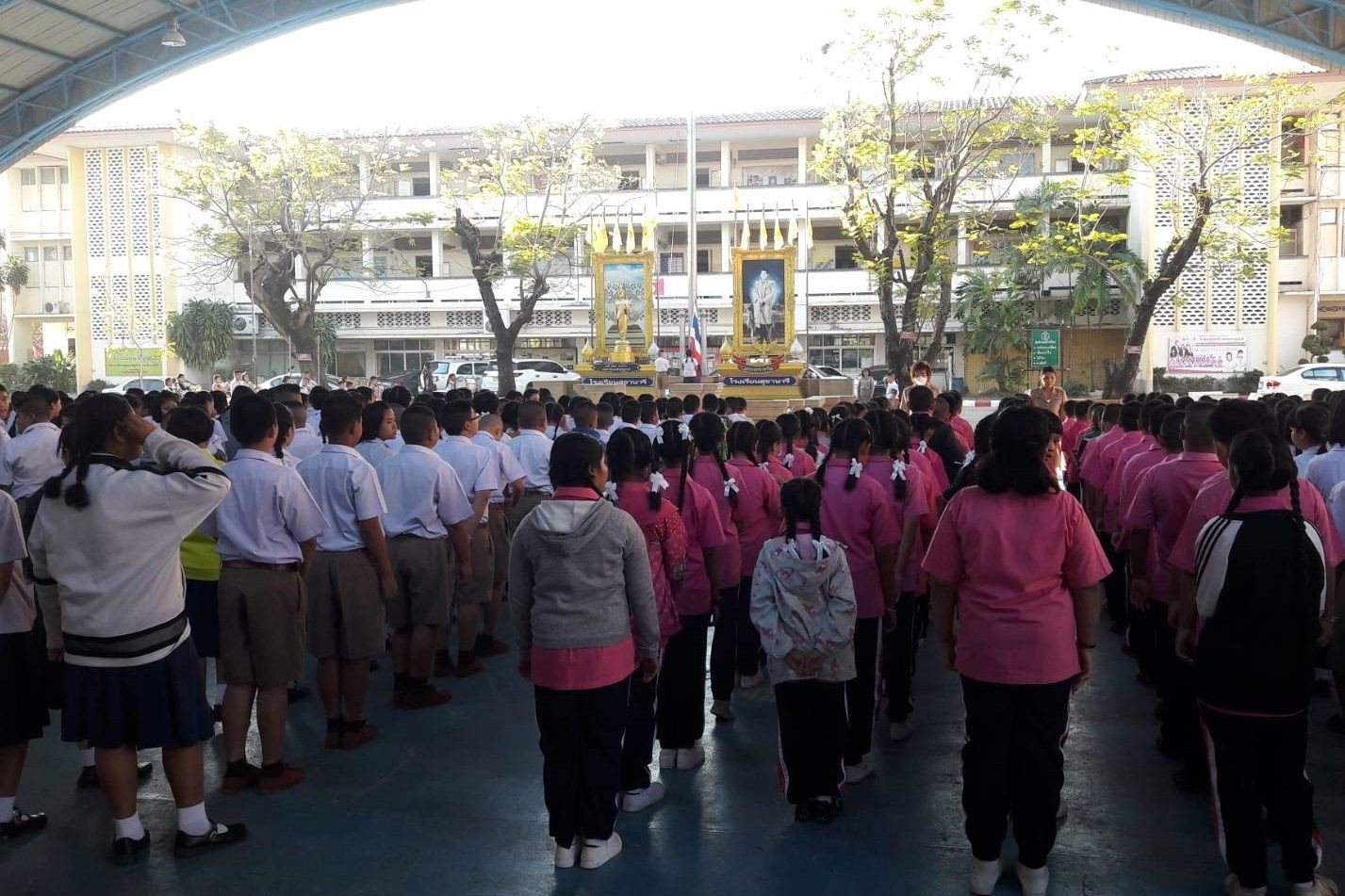 ที่ด้านหน้าประตูทางเข้า มีครูและสารวัตรนักเรียนคอยอำนวยความสะดวกด้านการจราจร และยืนรอต้อนรับนักเรียนที่ทยอยเดินทางมาต่อเนื่อง ขณะที่บรรยากาศภายในโรงเรียน เป็นไปด้วยความสงบเรียบร้อย ก่อนที่เวลา 08.00 น. เด็กนักเรียนทั้งหมดกว่า 2,800 คน ได้มารวมตัวเข้าแถวที่บริเวณอาคารอเนกประสงค์ เพื่อทำความเคารพธงชาติ ไหว้พระสวดมนต์ ก่อนเข้าเรียนตามปกติ วันนี้โรงเรียนจะให้ครูประจำชั้นเรียนสุ่มตรวจกระเป๋านักเรียนช่วงเข้าห้องเรียนด้วย