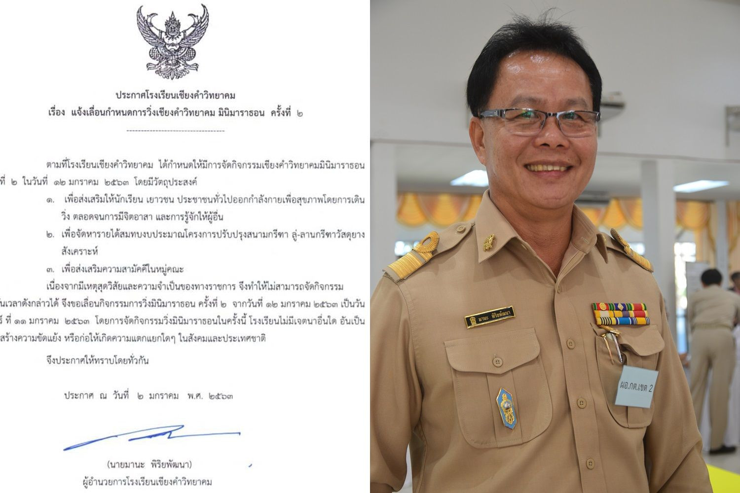 นายมานะ พิริยพัฒนา ผู้อำนวยการโรงเรียน เชียงคำวิทยาคม(ชคว.) อ.เชียงคำ จ.พะเยา ประกาศเลื่อนกิจกรรมวิ่งมินิมาราธอน ครั้งที่ 2 ชื่อ “เชียงคำวิทยาคม มินิมาราธอน 2020” จากเดิมวันที่ 12ม.ค.63 เป็นวันที่ 11ม.ค.63 ซึ่งตรงกับวันเด็กแห่งชาติปี2563แทน เนื่องจากเห็นว่าวันเดิมตรงกับกิจกรรมการเมือง ที่มีการจัดกิจกรรม"วิ่งไล่ลุง" โรงเรียน ชคว.เกรงจะมีผู้ไม่หวังดีสร้างสถานการณ์ หรือฉวยโอกาสนำกิจกรรมวิ่งมินิมาราธอนฯไปเป็นประเด็นทางการเมือง