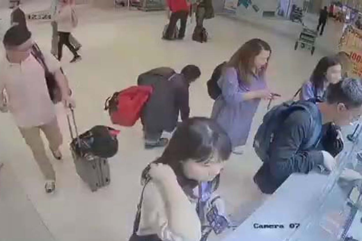 ภาพกล้องวงจรปิดบริเวณจุดแลกเงินซูปเปอร์ลีช ภายในแอร์พอร์ตลิ้ง สนามบินสุวรรณภูมิ จ.สมุทรปราการ บันทึกภาพขณะที่ชายสวมเสื้อยืดด้านในสีขาวมีแว่นตาเหน็บคอเสื้ออยู่ และสวมเสื้อแขนยาวสีดำทับ สวมกางเกงยีนส์ขายาว กำลังยืนรอเข้าคิวแลกเงินตามปกติ แต่หลังจากนั้นได้มีนักท่องเที่ยวสองสามีภรรยา ที่ฝ่ายชายลากกระเป๋าสัมภาระ ส่วนภรรยาอุ้มลูกน้อยวัย 10 เดือนอยู่ที่เอว ได้เดินลากกระเป๋าสัมภาระซึ่งมีกระเป๋าสะพายสีดำวางไว้บนกระเป๋าลากอีกที