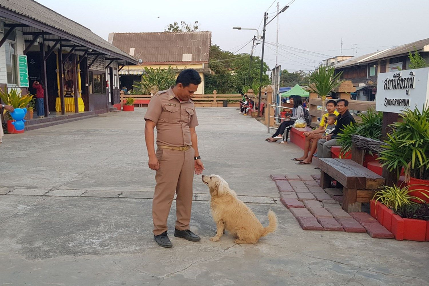 นายณรงค์ศักดิ์ คำปุย อายุ 45 ปี พนักงานคุมปะแจ สถานีรถไฟศีขรภูมิ เล่าให้ฟังว่า สุนัขเพศเมียชื่อกี้ เป็นสุนัขเร่ร่อน มาพร้อมกับเจ้าของและไม่กลับตามไปได้มาอาศัยอยู่บริเวณสถานีรถไฟศีขรภูมิ และไม่ยอมไปไหน ด้วยความสงสารตนเลยให้อาหารทุกวันและตั้งชื่อให้ว่าเจ้ากี้ เลี้ยงมาได้ประมาณ 7 ปีแล้ว เจ้ากี้เป็นสุนัข อารมณ์ดีไม่ดุร้าย ขนาดทดลองเปิดเพลงชาติไทย จากยูทูป พอเจ้ากี้ได้ยินเสียงเพลงชาติไทย ก็จะร้องตามทันที