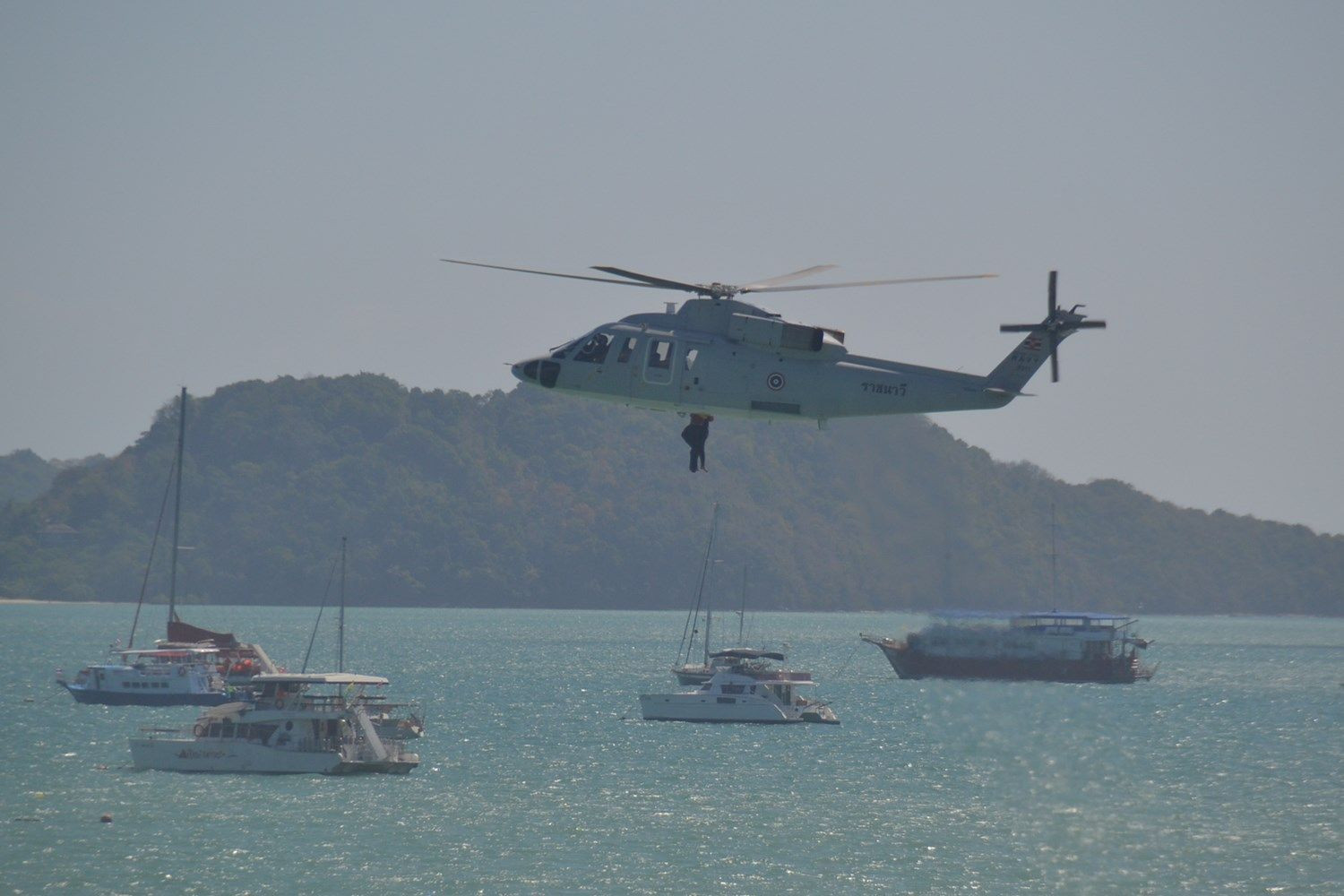 จากนั้น มีการสาธิตการช่วยเหลือผู้ประสบภัยทางทะเล โดยสถานการณ์สมมุติมีการจำลองเหตุการณ์เรือท่องเที่ยว นิกร มารีน ขนาดใหญ่อับปาง เนื่องจากระบบปั๊มน้ำเรือขัดข้อง บริเวณระหว่างเกาะราชากับเกาะเฮ จากนั้นศูนย์ ศรชล.ได้วิทยุสื่อสารไปยังหน่วยต่าง ๆ ทุกหน่วยงานระดมสรรพกำลังเจ้าหน้าที่ อุปกรณ์กู้ชีพกู้ภัย ในการให้ความช่วยเหลือทั้งทางทะเลและอากาศยาน เพื่อให้ความช่วยเหลือนักท่องเที่ยว การสาธิตการช่วยเหลือนักท่องเที่ยวครั้งนี้เป็นไปด้วยความเรียบร้อย ท่ามกลางสายตาของนักท่องเที่ยวทั้งชาวไทย ชาวจีน ชาวต่างชาติ เเละสื่อมวลชนร่วมสังเกตุการณ์จำนวนมาก