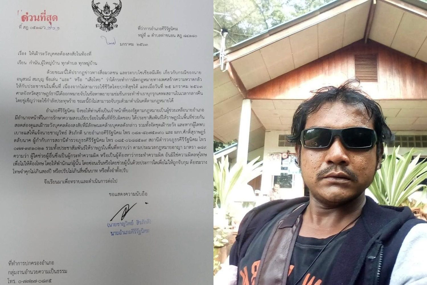 สุราษฎร์ธานี-นายอำเภอศีรีรัฐนิคม มีหนังสือด่วนถึงกำนัน ผู้ใหญ่บ้าน ให้เฝ้าระวังเสือโหย ผู้ต้องหาตามหมายจับศาลสุราษฎร์ฯก่อคดีพยายามข่มขืนไม่เว้นญาติสาวนามสกุลเดียวกัน