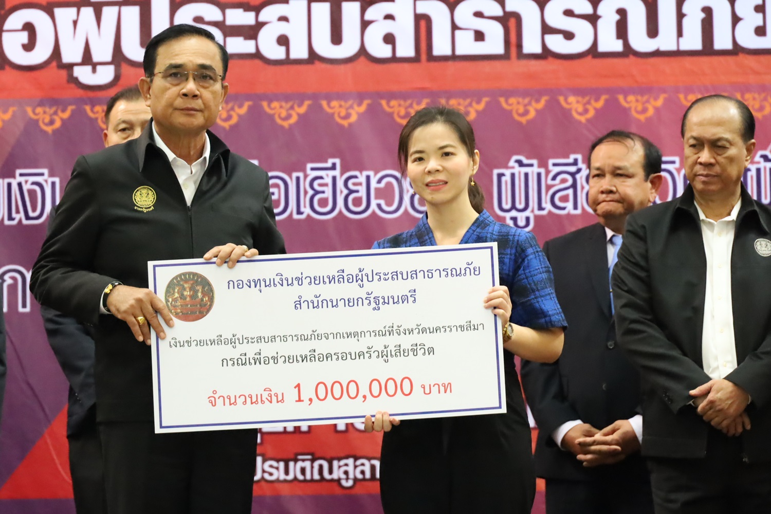 จากนั้น คณะของนายกรัฐมนตรีได้เดินทางไปที่หอประชุมเปรมติณสูลานนท์ ศาลากลางจังหวัดนครราชสีมา เพื่อมอบเงินช่วยเหลือเยียวยาผู้ได้รับบาดเจ็บ และครอบครัวผู้เสียชีวิตจากเหตุการณ์คนร้ายกราดยิงกลางเมืองจังหวัดนครราชสีมา เมื่อวันที่ 8 และ 9 กุมภาพันธ์ที่ผ่านมา โดยเป็นเงินจากกองทุนผู้ประสบสาธารณภัย สำนักนายกรัฐมนตรี และเงินเยียวยาเหยื่ออาชญากรรมตามพระราชบัญญัติค่าตอบแทนผู้เสียหาย และค่าทดแทน และค่าใช้จ่ายแก่จำเลยในคดีอาญา พ.ศ.2544 และที่แก้ไขเพิ่มเติม (ฉบับที่ 2) พ.ศ.2559 โดยมอบเงินเยียวยาให้แก่ครอบครัวผู้เสียชีวิตจำนวน 27 ราย รายละ 1 ล้านบาท ผู้ที่ได้รับบาดเจ็บสาหัส รายละ 200,000 บาท และผู้ได้รับบาดเจ็บไม่สาหัส รายละ 100,000 บาท