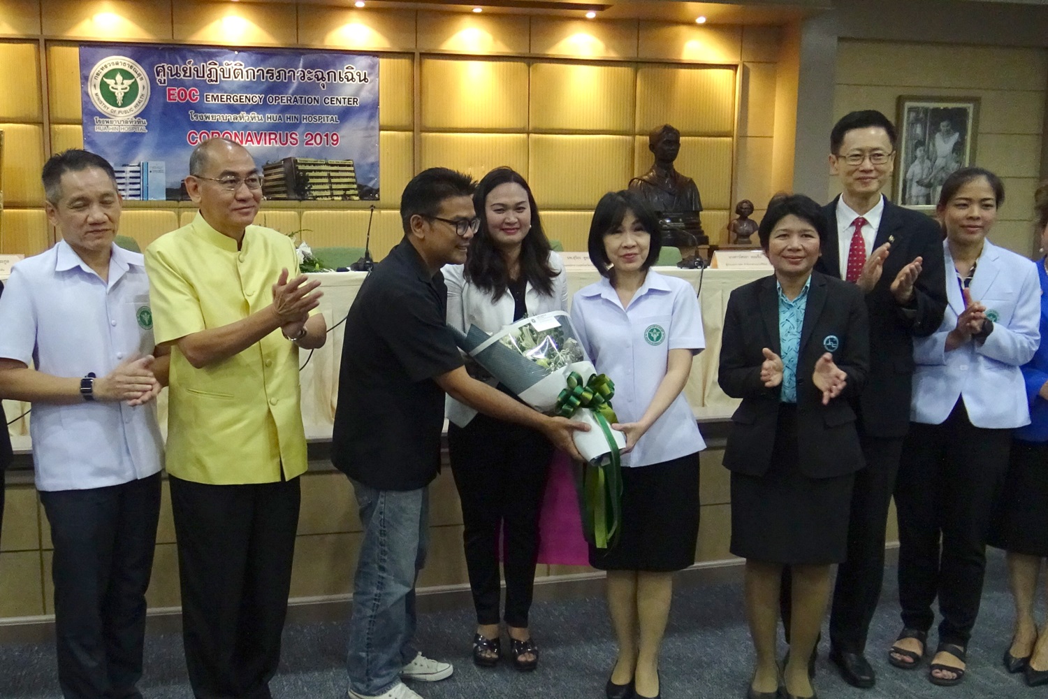 เมื่อวันที่ 19 ก.พ.63 ที่ห้องประชุมอาคารเฉลิมพระเกียรติ โรงพยาบาลหัวหินอ.หัวหิน จ.ประจวบคีรีขันธ์ นายพัลลภ สิงหเสนี ผู้ว่าราชการจังหวัดประจวบคีรีขันธ์พร้อมด้วย แพทย์หญิงอัมพร เบญจพลพิทักษ์ ผู้ตรวจราชการกระทรวงสาธารณสุข เขตสุขภาพที่ 5, นายแพทย์สุริยะ คูหะรัตน์ นายแพทย์สาธารณสุขจังหวัดประจวบคีรีขันธ์,นายแพทย์นิรันดร์ จันทร์ตระกูล ผู้อำนวยการโรงพยาบาลหัวหิน ,นางสาวโศรยา หอมชื่น ผู้อำนวยการการท่องเที่ยวแห่งประเทศไทย สำนักงานประจวบคีรีขันธ์ พร้อมด้วยนายสมิทธิ์ จันทร์หอม อายุ 45 ปี ชาวหัวหิน ซึ่งเคยเป็นผู้ป่วยติดเชื้อไวรัสโควิด-19 อาชีพขับรถแท็กซี่ มาแถลงข่าวต่อสื่อมวลชน โอกาสนี้ผู้ว่าราชการจังหวัดและคณะแพทย์ได้มอบช่อดอกไม้แสดงความยินดีจากอธิบดีกรมควบคุมโรค,อธิบดีกรมการแพทย์ และรองอธิบดีกรมอนามัย รวมทั้งมอบเงินช่วยเหลือบรรเทาความเดือดร้อนจากกองทุนธารน้ำใจใต้ร่มพระบารมี ซึ่งคณะกรรมการระดับจังหวัดได้พิจารณาช่วยเหลือเป็นกรณีพิเศษ