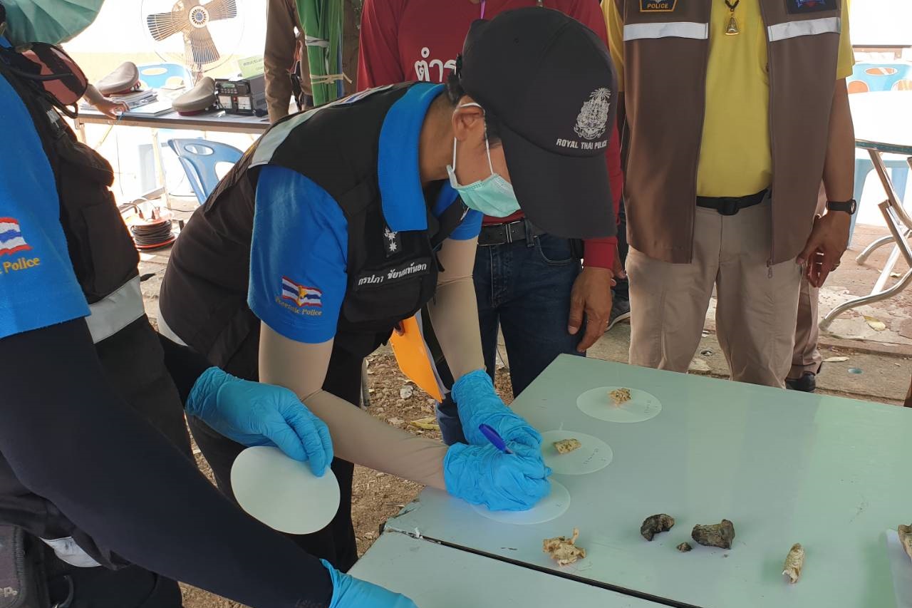 ขณะนี้ ทางเจ้าหน้าที่ได้มีการนำซากกระดูกจำนวนดังกล่าวขึ้นมาบนฝั่ง เพื่อให้ทางเจ้าหน้าที่หน่วยพิสูจน์หลักฐานเข้าตรวจสอบว่าเป็นกระดูกของมนุษย์ หรือสัตว์ แต่จากการสังเกตกระดูกที่พบ จำนวน 6 ชิ้นแรก เป็นเศษกระดูกชิ้นเล็ก ส่วนชิ้นที่ 7 มีการแบ่งเป็น 2 ส่วน โดยมีส่วนหนึ่งคล้ายกระดูกซี่โครง และอีกท่อนคล้ายกับกระดูกท่อนแขน ซึ่งยังคงต้องรอผลการตรวจสอบให้แน่ชัดก่อน