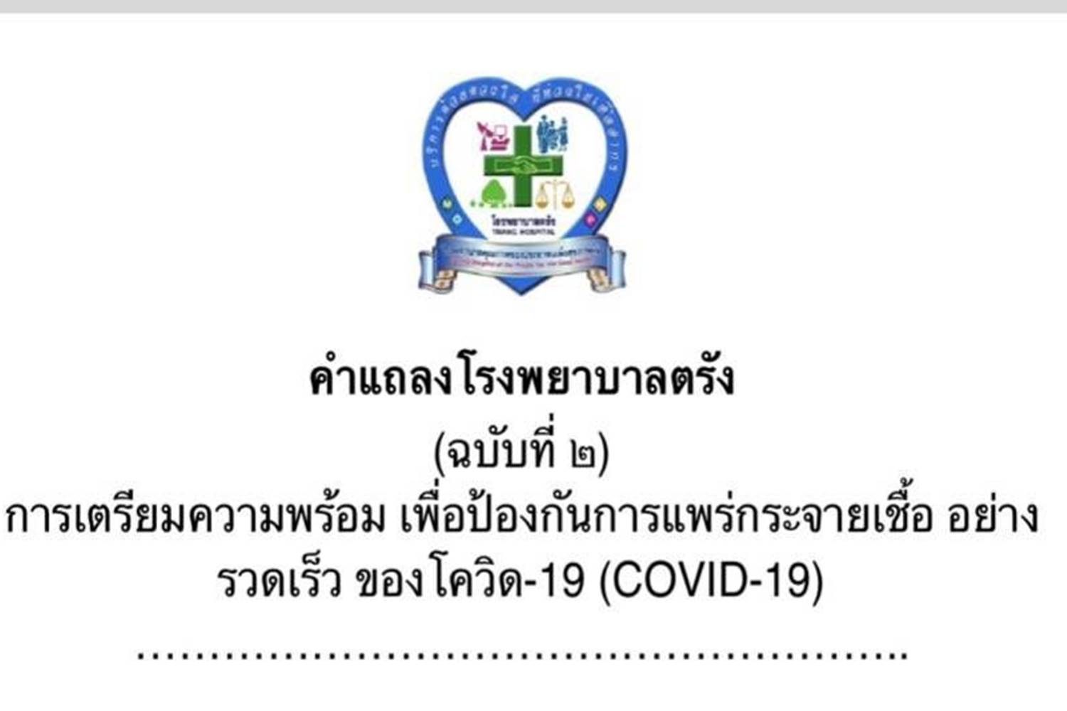 เมื่อวันที่ 29 ก.พ. 63 นางจิรวรรณ อารยะพงษ์ ผู้อำนวยการ โรงพยาบาลตรัง ได้ออกแถลงการณ์ฉบับที่ 2 เรื่องการเตรียมความพร้อมเพื่อป้องกันการแพร่กระจายเชื้ออย่างรวดเร็วของ COVID-19 เนื่องจากประชาชนจังหวัดตรัง และประชาชนทั่วไป กังวลในเชื้อ COVID-19 ที่มีการระบาดในหลายประเทศ