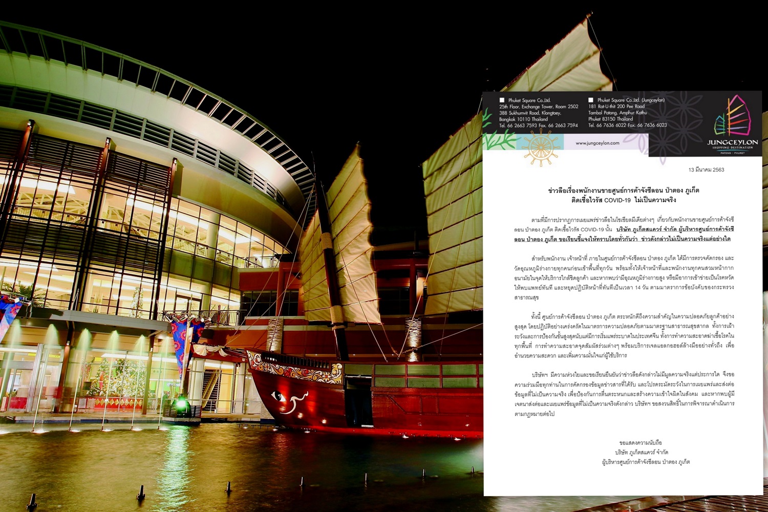 เมื่อวันที่ 13 มีนาคม 2563 ฝ่ายประชาสัมพันธ์ บริษัท ภูเก็ตสแควร์ จำกัด ผู้บริหารศูนย์การค้าจังซีลอน ป่าตอง ภูเก็ต ชี้แจงว่า กรณีมีการเผยแพร่ข่าวลื่อในโซเชียล เกี่ยวกับพนักงานขายศูนย์การค้าจังซีลอน ป่าตอง ภูเก็ต ติดเชื้อไวรัส COVID-19 ข่าวดังกล่าวไม่เป็นความจริงแต่อย่างใด