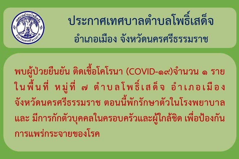 เทศบาลตำบลโพธิ์เสด็จ อ.เมือง จ.นครศรีธรรมราช ประกาศทางเฟซบุ๊กว่า พบผู้ป่วยยืนยันติดเชื้อโคโรนา (Covid-19) ในพื้นที่หมู่7 ตำบลโพธิ์เสด็ต อ.เมือง จ.นครศรีธรรมราช ตอนนี้พักรักษาตัวในโรงพยาบาล และมีการกักตัวบุคคลในครอบครัวและผู้ใกล้ชิด เพื่อป้องกันการแพร่กระจายของโรค