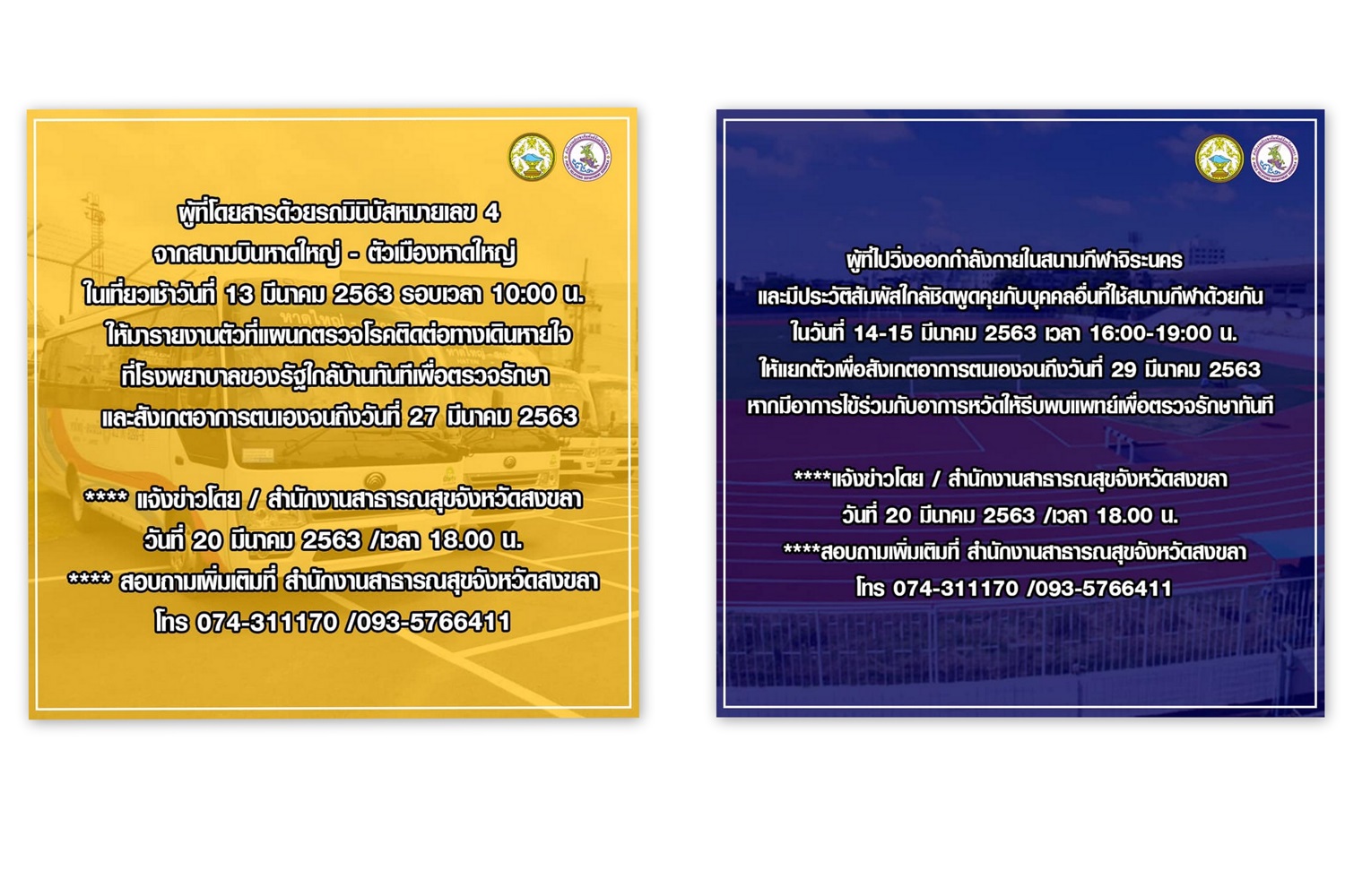 สำนักงานสาธารณสุขจังหวัดสงขลา แจ้งด่วน ผู้ที่โดยสารด้วยรถมินิบัสหมายเลข 4 จากสนามบินหาดใหญ่ - ตัวเมืองหาดใหญ่ ในเที่ยวเช้าวันที่ 13 มีนาคม 2563 รอบเวลา 10:00 น. ให้มารายงานตัวที่แผนกตรวจโรคติดต่อทางเดินหายใจที่โรงพยาบาลของรัฐใกล้บ้านทันที เพื่อตรวจรักษา และสังเกตอาการตนเองจนถึงวันที่ 27 มีนาคม 2563 และผู้ที่ไปวิ่งออกกำลังกายในสนามกีฬาจิระนครและมีประวัติสัมผัสใกล้ชิดพูดคุยกับบุคคลอื่นที่ใช้สนามกีฬาด้วยกัน ในวันที่ 14-15 มีนาคม 2563 เวลา 16:00-19:00 น. ให้แยกตัวเพื่อสังเกตอาการตนเองจนถึงวันที่ 29 มีนาคม 2563 หากมีอาการไข้ร่วมกับอาการหวัด ให้รีบพบแพทย์เพื่อตรวจรักษาทันที