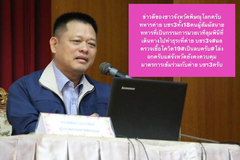 นายพิพัฒน์ เอกภาพันธ์ ผู้ว่าราชการจังหวัดพิษณุโลก ได้โพสต์ข้อความผ่านเฟซบุ๊กว่า “ข่าวดีของชาวจังหวัดพิษณุโลกครับทหารค่าย บชร3 ทั้ง18คนผู้สัมผัสนายทหารที่เป็นกรรมการมวยเวทีลุมพินีที่เดินทางไปทำธุระที่ค่าย บชร3 ผลตรวจเชื้อโควิด19 เป็นลบครับ โล่งอกครับแต่จังหวัดยังคงควบคุมมาตรการเข้มร่วมกับค่าย บชร3ครับ” ทำให้ประชาชนชาวพิษณุโลกหลายคนเข้ามาแชร์และคอมเม้นกันจำนวนมาก"