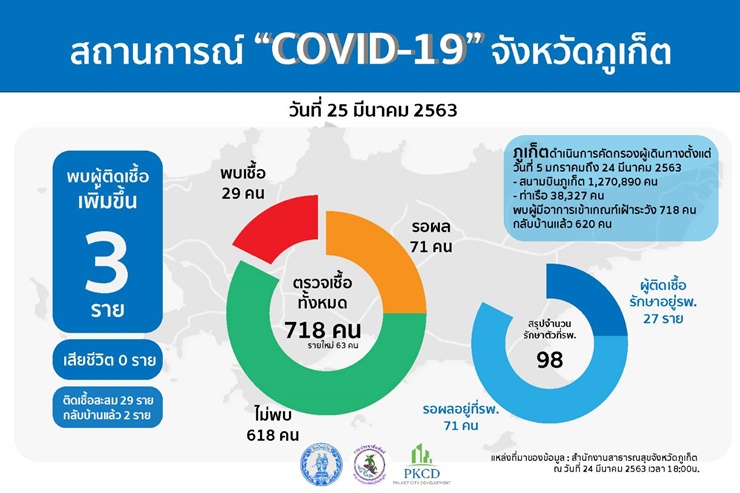 เมื่อวันที่ 25 มี.ค. นพ.ธนิศ เสริมแก้ว นายแพทย์สาธารณสุขจังหวัดภูเก็ต กล่าวว่า ข้อมูลสถานการณ์โควิด -19 จังหวัดภูเก็ต ประจำวันที่ 25 มี.ค. 2563 พบผู้ป่วยติดเชื้อยืนยันเพิ่มขึ้น 3 ราย รวมผู้ป่วยติดเชื้อยืนยันสะสม 29 ราย รักษาหายกลับบ้านแล้ว 2 ราย ยังคงเหลือรักษาที่โรงพยาบาล 27 ราย ตรวจเชื้อทั้งหมด 718 ราย ไม่พบ 618 ราย พบเชื้อ 29 ราย รอผล 71 ราย สรุปจำนวนรักษาตัวที่โรงพยาบาล 98 ราย ทุกรายไม่มีอาการรุนแรง