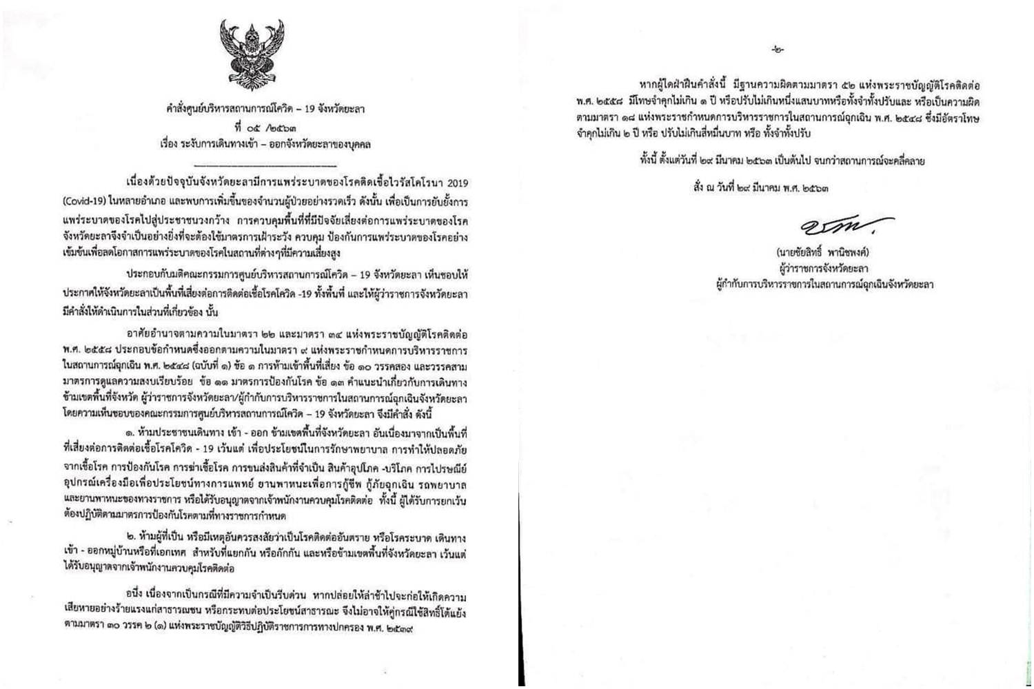 เมื่อวันที่ 29 มี.ค. 63 ศูนย์บริหารสถานการณ์โควิด-19 จังหวัดยะลา โดยนายชัยสิทธิ์ พานิชพงศ์ ผู้ว่าราชการจังหวัดยะลา ในฐานะ ผู้กำกับการบริหารราชการในสถานการณ์ฉุกเฉินจังหวัดยะลา ได้ออกคำสั่งที่ 05/2563 เรื่อง ระงับการเดินทางเข้า-ออกจังหวัดยะลาของบุคคล โดยมีสาระสำคัญดังนี้