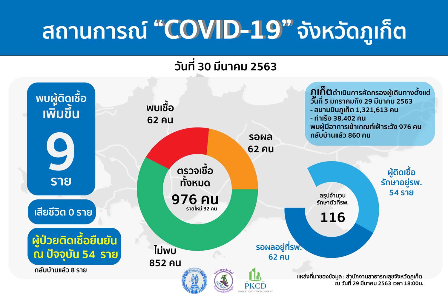 เมื่อวันที่ 30 มี.ค. 63 คณะกรรมการโรคติดต่อจังหวัดภูเก็ต รายงาน สถานการณ์โรคติดเชื้อไวรัสโคโรนา 2019 (โควิด-19) จังหวัดภูเก็ตว่า จังหวัดภูเก็ตมีผู้ป่วยยืนยันติดเชื้อโควิด-19 รายใหม่เพิ่ม 9 ราย ทำให้มียอดผู้ป่วยสะสม 62 ราย รักษาหายกลับบ้านแล้ว 8 ราย กำลังรักษาอยู่ 54 ราย ทุกรายอาการอยู่ในเกณฑ์ที่ดี ไม่มีอาการรุนแรง