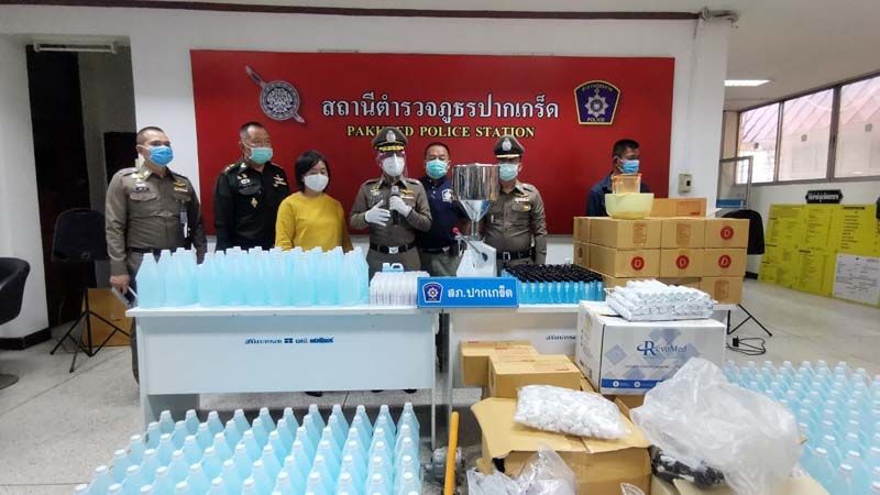 ทั้งนี้ จับได้พร้อมของเป็นแอลกอฮอลล์จำนวน 42 ถัง ความจุถังละ 200 ลิตร รวม 8,400 ลิตร แอลกอฮอลล์บรรจุในแกลลอนพลาสติกขนาดเล็กจำนวน 720 แกลลอน เครื่องบรรจุขวด 1 ตัว เจลอนามัยล้างมือบรรจุในขวดพลาสติกขนาดเล็กไม่มีฉลากผนึก 600 ขวด และแอลกอฮอลล์บรรจุขวดพลาสติกขนาดเล็ก จำนวน 1,200 ขวด