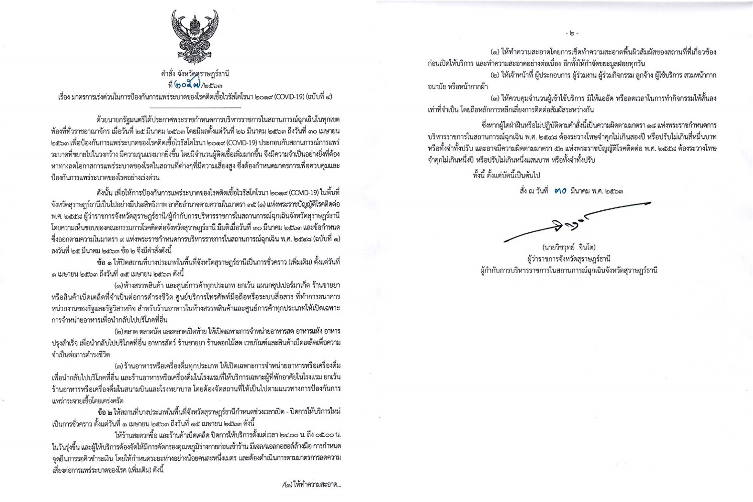 เมื่อวันที่ 30 มีนาคม นายวิชวุทย์ จินโต ผู้ว่าราชการจังหวัดสุราษฎร์ธานี ในฐานะผู้กำกับการบริหารราชการในสถานการณ์ฉุกเฉินจังหวัดสุราษฎร์ธานี มีคำสั่งจังหวัดสุราษฎร์ธานี ที่ 2057/2563 ให้ปิดสถานที่บางประเภทในพื้นที่เป็นการชั่วคราว (เพิ่มเติม) ตั้งแต่วันที่ 1 -15 เมษายน 2563