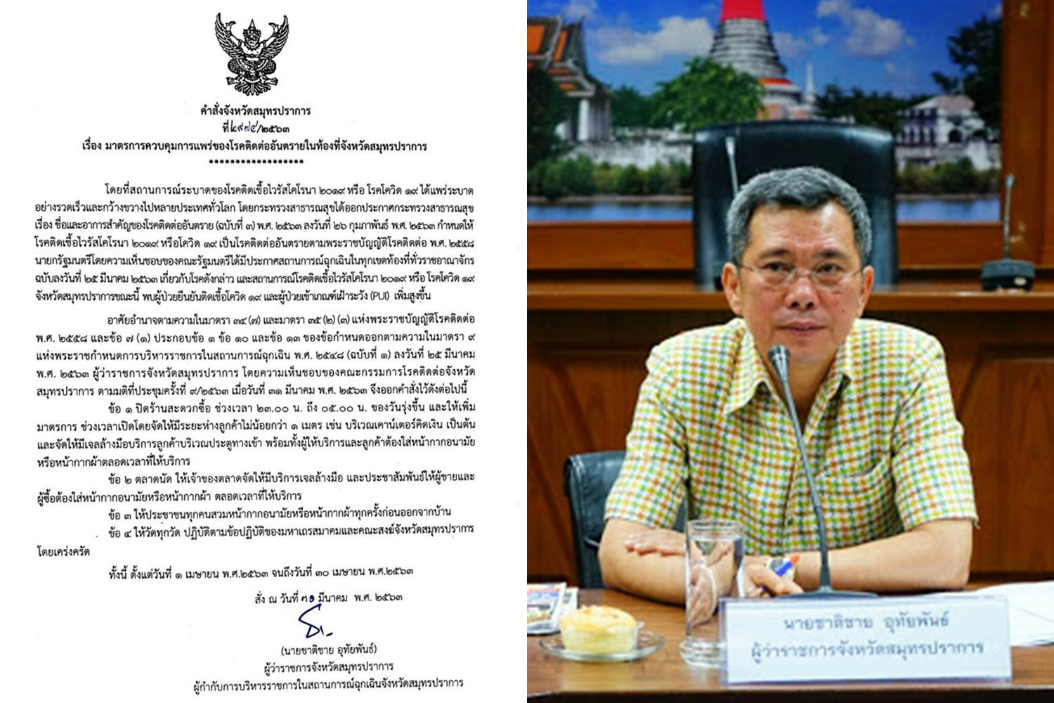 เมื่อวันที่ 31 มี.ค.นายชาติชาย อุทัยพันธ์ ผวจ.สมุทรปราการได้ลงนามในคำสั่งจังหวัดสมุทรปราการที่ 2974/2533 เรื่อง มาตรการควบคุมการแพร่ของโรคติดต่ออันตรายในท้องที่จังหวัดสมุทราการ สาระสำคัญดังนี้