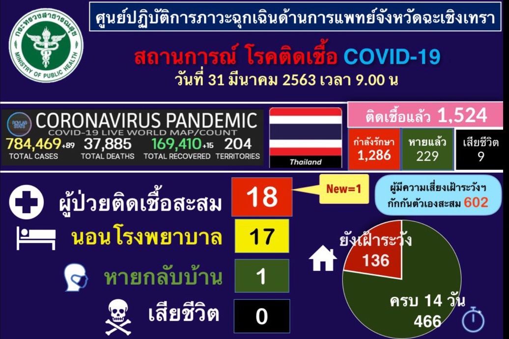 ทำให้ขณะนี้ จ.ฉะเชิงเทรา มีผู้ติดเชื้อสะสมรวม 18 ราย รักษาหายแล้ว 1 ราย จึงยังคงเหลือผู้ที่อยู่ในการดูแลของแพทย์ 17 ราย มีจำนวนผู้ต้องสงสัยการส่งตรวจหาเชื้อ 216 ราย ยังรอผลการตรวจอีก 7 ราย และอยู่ในข่ายต้องเฝ้าระวังอีก 136 ราย