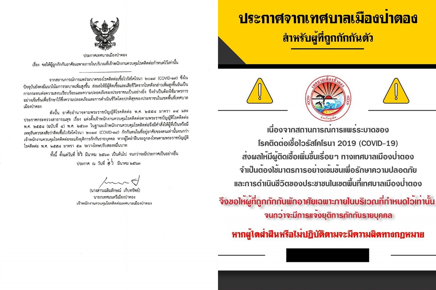 เมื่อวันที่ 1 เมษายน 2563 นางสาวเฉลิมลักษณ์ เก็บทรัพย์ นายกเทศมนตรีเมืองป่าตอง เปิดเผยว่า เนื่องจากสถานการณ์แพร่ระบาดโควิด-19 ทำให้มีผู้ติดเชื้อเพิ่มขึ้นต่อเนื่องจำเป็นต้องใช้มาตรการอย่างเข้มข้น เพื่อรักษาความปลอดภัยและการดำเนินชีวิตของประชาชนในพื้นที่ เทศบาลเมืองป่าตองจึงขอให้ผู้ที่ถูกกักกันอาศัยเฉพาะภายในบริเวณที่เจ้าพนักงานควบคุมโรคติดต่อกำหนดไว้เท่านั้น จนกว่าจะมีการแจ้งยุติการกักกันรายบุคคล หากผู้ใดฝ่าฝืนหรือไม่ปฏิบัติตามจะมีความผิดทางกฏหมาย