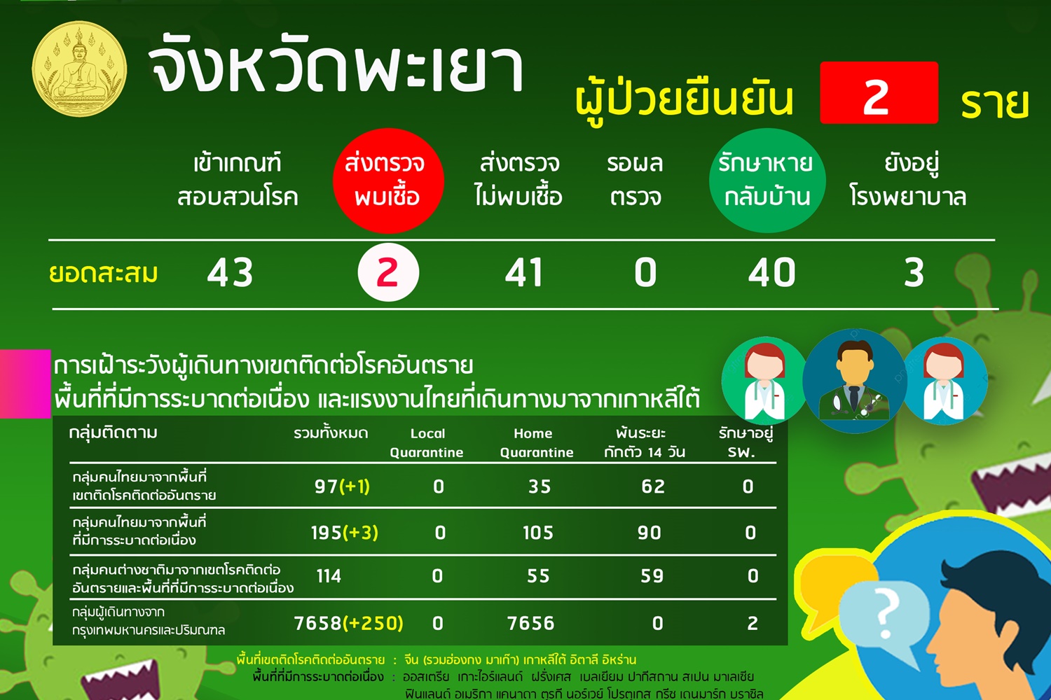 พะเยา-ศูนย์ข้อมูล COVID -19 พะเยา เผยตัวเลขป่วยคงวิดคงที่2 รักษาหายกลับบ้าน40 นอนร.พ.5ราย เฝ้าระวัง4กลุ่มเสี่ยง