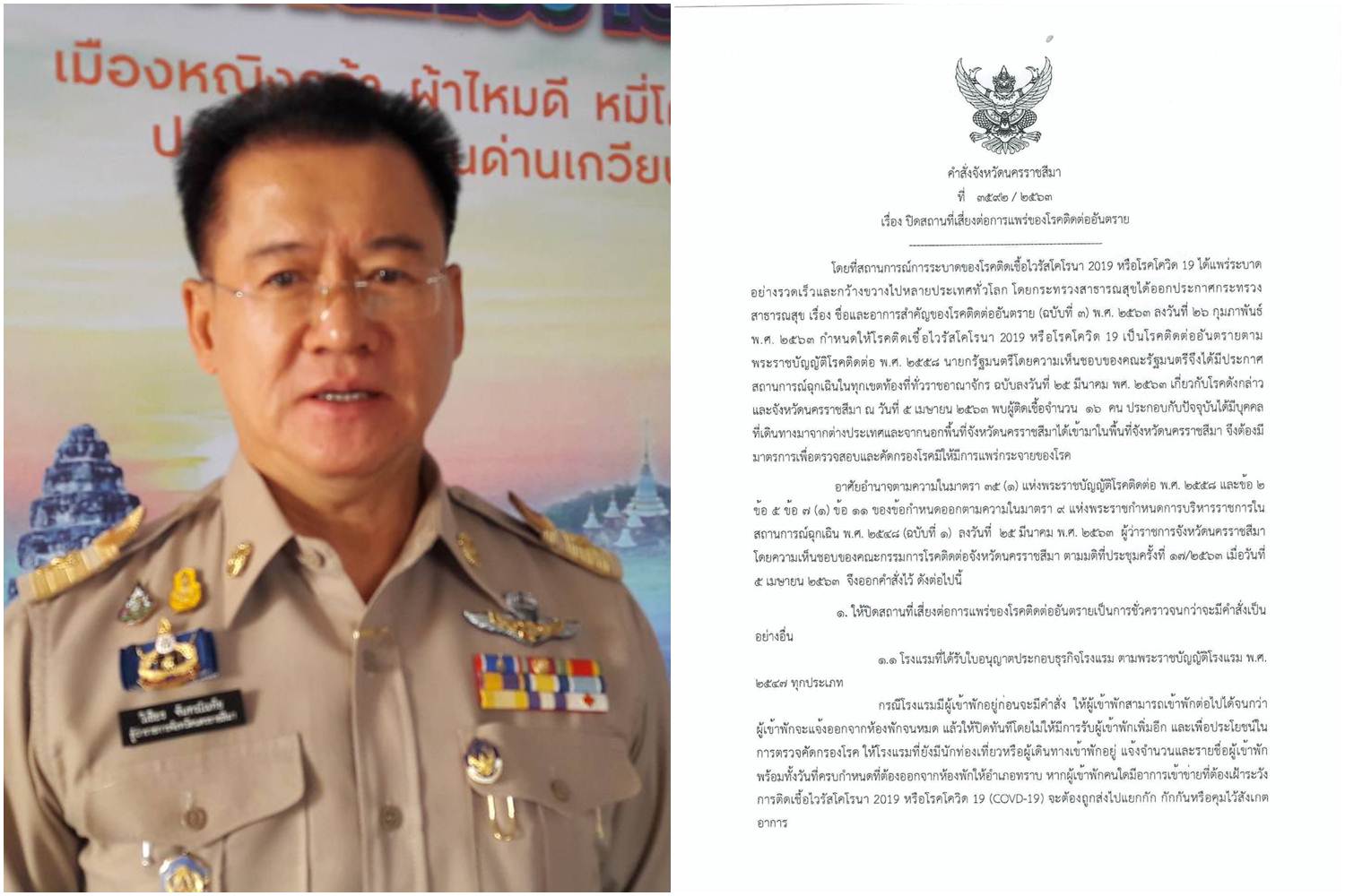 เมื่อวันที่ 6 เม.ย. 63 นายวิเชียร จันทร์โณทัย ผู้ว่าราชการจังหวัดนครราชสีมา ในฐานะประธานคณะกรรมการโรคติดต่อจังหวัดนครราชสีมา ได้มีคำสั่งจังหวัดนครราชสีมาที่ 3592/2563 เรื่อง ปิดสถานที่เสี่ยงต่อการแพร่ของโรคติดต่ออันตราย โดยได้มีคำสั่งปิดโรงแรมที่ได้รับใบอนุญาตประกอบธุรกิจโรงแรม ตาม พ.ร.บ.โรงแรม พ.ศ.2547 ทุกประเภท